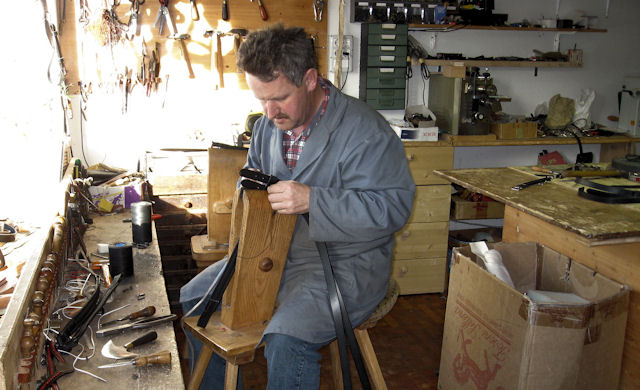 Auf dem Nähroß kann der Sattler sitzen und die Lederstücke nähen.