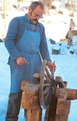 Die Felgenbank war eine sehr stabile Vorrichtung, in die das Rad zur Fertigung fest eingespannt werden konnte und für die Montage benutzt wurde.