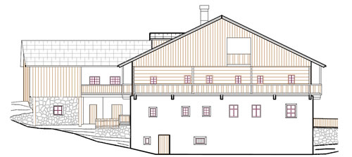 Die Ausrichtung des Gebäudes erfolgt in steilen Lagen parallel zum Hang, während es in sanften Lagen auch Typen gibt, die quer zum Hang stehen.