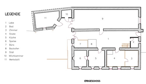 Nebengebäude wie Speicher, Backöfen, Mühlen und Wasserbrunnen werden ebenso unterschiedlich angeordnet, meistens beeinflusst von den lokalen Gegebenheiten, den betrieblichen Abläufen oder den Witterungseinflüssen.