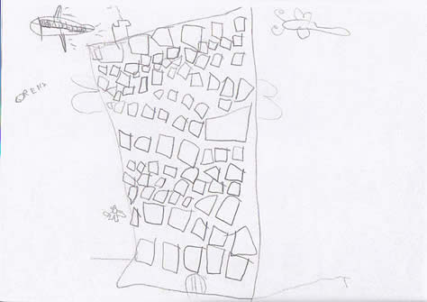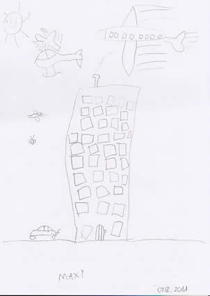 Da ist ein Hochhaus, da geht eine Stiege bis zum Dach.