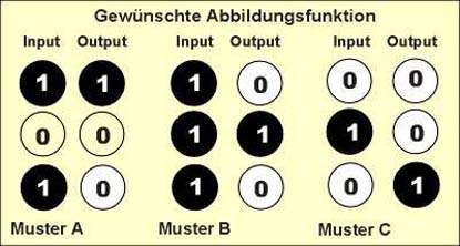 Die drei Muster A, B und C sollen erkannt werden und eine je spezifische Reaktion zur Folge haben. Wenn das Muster A erkannt wird, so soll Outputneuron 1 "aktiv" sein, wenn Muster B erkannt wird, so soll Outputneuron 2 "aktiv" sein und entsprechend soll Outputneuron 3 "aktiv" sein, wenn das Muster C erkannt wird.