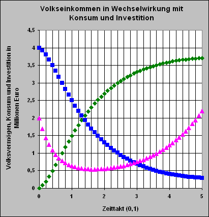 Die Koeffizienten, die in obigem Wechselwirkungsmodell für Konsum und Investition gewählt wurden, werden hier beibehalten. Lediglich für Δt wird 0,1 gewählt. Das entspricht aber der zweiten oben dargestellten Simulation.