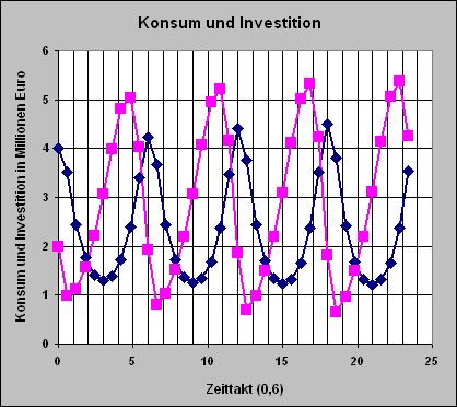 Der Zweck des Modells kann also genau diese qualitative Erkenntnis sein: Konsum und Investition schwingen zeitversetzt und gegenläufig immer zeitlich etwas nachhinkend.