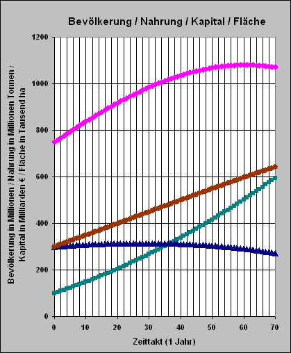 Wir programmieren zunächst nur die vier Zustandsgleichungen für Bevölkerung, landwirtschaftlich genutztes Kapital, landwirtschaftlich genutzte Fläche und Nahrungsproduktionsmenge sowie die zugehörigen Modellgleichungen. Die Zahlen sind auf eine oder drei Stellen hinter dem Komma gerundet.