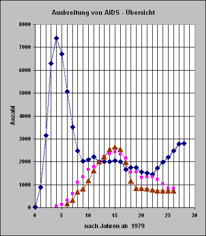 Eine breit angelegte Aufklärung (auch in den Schulen) in den Jahren 1979 bis fast 1987 sorgte dafür, dass die Ausbreitung des HI-Virus bis zum Jahr 1988 nahezu exponentiell abnahm. Dann aber kam eine Zeit, in der dem tödlich wirkenden Virus wenig Beachtung geschenkt wurde. Die Folge war, dass sich ab dem Jahr 2002 das Virus wieder nahezu exponentiell ausbreitete. Erst in den beiden letzten Jahren kommt die Ausbreitung auf einem - für Deutschland - sehr hohen Niveau zum Stillstand bzw. zu einem leichten Rückgang der Ausbreitung.