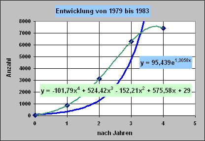 Betrachten wir nur die Entwicklung von 1979 bis 1982, so ergibt sich mittels einer exponentiellen Trendlinie die Funktion y = 61,699e^1,742x