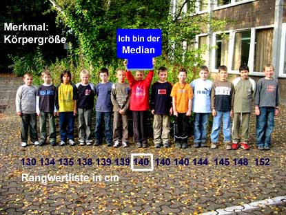 Die Jungen sind im Bild der Größe nach aufgestellt. Unter ihren Füßen sind ihre Körpergrößen - der Größe nach geordnet - eingetragen. Das ist die Rangwertliste: