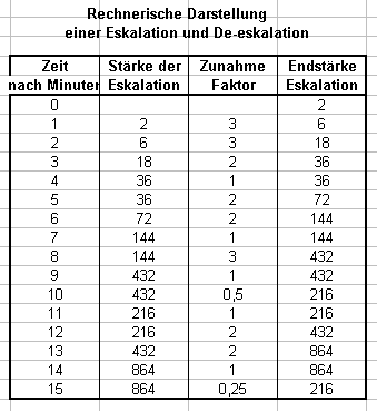 Sicher darf man auch annehmen, dass von Außen versucht wird, das Konflikt- oder Gewaltpotential zu mindern. Das spricht für einen veränderlichen Zunahme-Faktor. Die Eskalation kann dann z.B. nach einiger Zeit auf einem bestimmten Niveau stehen bleiben oder sogar auch wieder abnehmen. |
