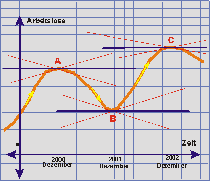 A und C des Graphen kennzeichnen minimale Anzahlen. Legt man links und rechts von diesen Punkten Sekanten an den Graphen, so wechselt die Steigung der Sekanten von negativ nach positiv. Und dazwischen liegt eine Sekante (blau), die gar keine Steigung hat bzw. deren Steigung Null ist.