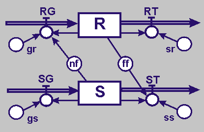 S Spinnmilbe und R Raubmilbe sind die Zustandsgrößen. SG Spinnmilbengeburt; RG Raubmilbengeburt; ST Spinnmilbentod und RT Raubmilbentod sind die Flussgrößen. gsp = Geburtenrate Spinnmilben gr = Geburtenrate Raubmilben; ssp = Sterberate Spinnmilben und sr = Sterberate Raubmilben sind die Parameter. |
