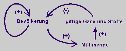 Mit dem Wachsen der Bevölkerung nimmt naturgemäß die Müllmenge zu. Denn je mehr Menschen leben, desto mehr Abfall entsteht. Aus dem Müll, wohin er auch gerät (in die Ozeane, in Müllverbrennungsanlagen, in Recyclingwerken), entweichen Stoffe, die vergiftend auf Mensch und Tier wirken. Und in Tieren (etwa in Fischen im Meer) sammeln sich außerdem z.B. Schadstoffe an, die in die Nahrungskette des Menschen geraten und dann "giftig" wirken. Das "Gift aus dem Müll" wirkt schließlich auf die Sterblichkeit, also auf die Todesfälle von Menschen zurück. Je mehr Gift frei gesetzt wird, desto größer wird die Sterberate der Menschen sein. Diese Dynamik lässt sich in dem folgenden Wirkungsdiagramm wie folgt in einem ersten Schritt aggregieren: