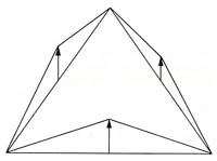 Man beginnt mit einem Dreieck (linke Spalte) in einer waagerechten Ebene und markiert die Mittelpunkte seiner Seiten. Diese Mittelpunkte werden nun senkrecht zur Dreiecksfläche um einen zufälligen Betrag (nach einem Zufalls- oder Verteilungsgesetz) nach oben oder unten verschoben. Die so erhaltenen Punkte bilden mit den alten Eckpunkten des Dreiecks drei kleinere Dreiecke, auf die man dasselbe Verfahren anwendet und so weiter. Abhängig vom Zufallsgesetz bilden sich schließlich nach einigen Hunderten von Iterationen Gebirgsgestalten.