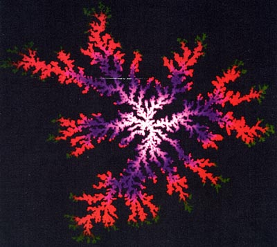 Abgebildet sind unten rechts das fraktale Muster eines Prozesses, der als diffusionsbegrenzte Anlagerung bezeichnet wird. Etwa 50 000 "Teilchen" wurden nacheinander in einem Gebiet außerhalb des Bildes gestartet und bewegten sich dann auf den Ursprung zu.