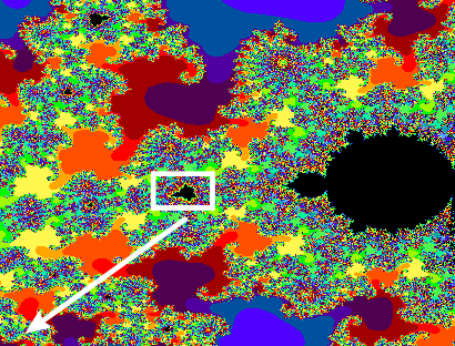 Die Bilder zeigen neben einer Fülle von faszinierenden Formen auch eine andere Regelmäßigkeit: Immer wieder taucht u.a. eine Kopie der Mandelbrot-Menge selbst auf.