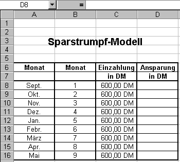 Nebenbei: Die Spalten "Einzahlung" und "Ansparung" lassen sich mit "Format > Zelle > Währung" auf Euro formatieren.