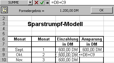Das bedeutet: In die Zelle D9 soll D8+C9 eingeschrieben werden. Mit OK wird dies vollzogen.