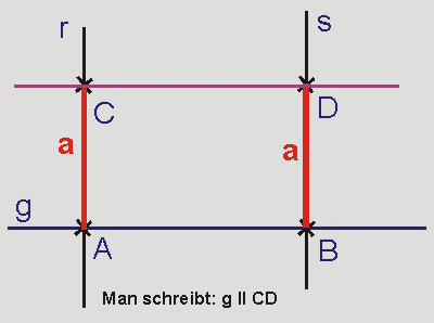 Die Gerade CD (violett) ist dann eine Parallele zu g im Abstand a.