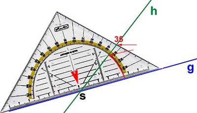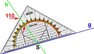 Die Geraden g und h schneiden sich in S. Der Punkt S liegt im Nullpunkt der Zeichenkante und die Gerade g liegt genau an der Zeichenkante des Geodreiecks.