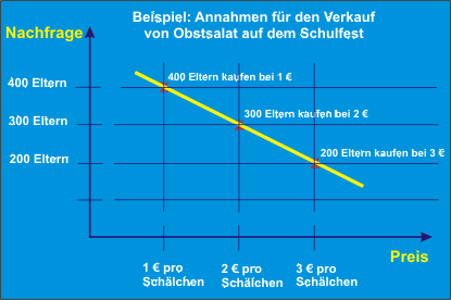 Auf einem "einfachen Markt" - etwa auf einem Schulfest - wird die Nachfrage nach Obstsalat in Schälchen dann geringer (kleiner) werden, wenn der Preis höher (größer) wird.