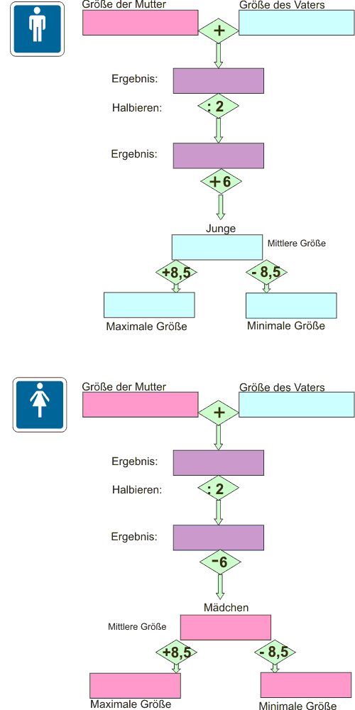 Die beiden folgenden Flussdiagramme beschreiben für Jungen und Mädchen einen Rechenweg, der zu ihrer geschätzen Körpergröße im Erwachsenenalter führt.