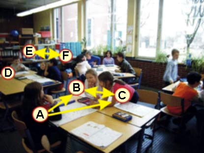 Experimentiert mit der Weitergabe einer Nachricht in Netzen. Färbt zu diesem Zweck im Netz den Ausgang der Nachricht rot, die zweite Station orange, die dritte violett und die vierte gelb.