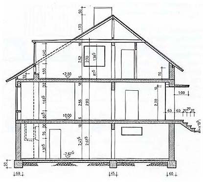 "Querschnitt" durch ein wirkliches Haus. Es ist eine Bauzeichnung.