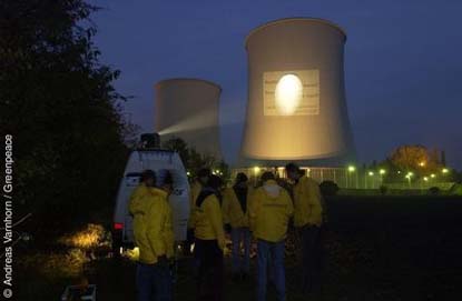 Im Bild wird gezeigt, wie eine Greenpeace-Gruppe am Abend die Projektion von Informationen nutzt, um die Öffentlichkeit auf ihr Anliegen aufmerksam zu machen.