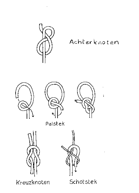 Versuche zuerst die Knoten einzeln nach der Vorlage zu üben, wenn du sie gut beherrschst, kannst du sie "auswendig" und in beliebiger Reihenfolge ausführen: |