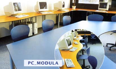 Ausstattungskonzept: Computerraum Dieses Konzept ist das am meisten genutzte. Ein Computerraum kann, wenn alle Computer in Reihen auf den Lehrer ausgerichtet sind, kontraproduktiv zum konstruktiven Lernen wirken, da der so eingerichtete Raum ein instruktionales Lernen nahe legt. Natürlich lässt sich der Computerraum auch so einrichten und gestalten, dass er eine arbeitsteilige Kleingruppenarbeit unterstützt, wie der Einblick in den Computerraum in Rechtental/Südtirol zeigen soll. Hier gibt es Computerecken rund herum und in der Mitte einen Besprechungstisch. |