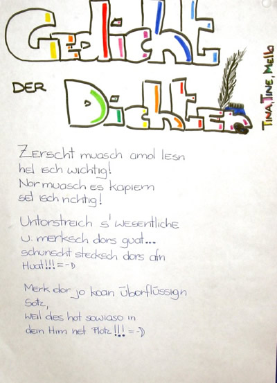 Dazu gehören das sinnvolle Markieren von Texten, das Erstellen von Schaubildern, die Informationssuche in verschiedenen Medien, das Planen und Organisieren von Schularbeiten und Hausarbeiten. Hilfen und Anregungen erfahren sie über Arbeitsblätter und in Gesprächen mit Mitschüler/innen und der betreuenden Lehrer/in.