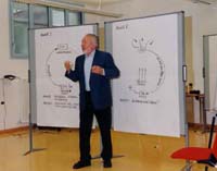 | Ein Beratungsgespräch wird simuliert: Eine Person/Gruppe stellt sich als Klient zur Verfügung, und zwar mit einem realen Problem. Ein Berater übernimmt es, die "richtigen" Präzisionsfragen zu finden. Dabei hat es sich gezeigt, dass der Einstieg in das Beratungsgespräch gut überlegt sein sollte. Auch ist es wichtig, dass der Berater bei sogenannten Signalwörtern wie z.B. Schwierigkeiten nachhakt, z.B. mit der Frage: Was für Schwierigkeiten sind das? Wenn der Berater selbst Gefahr läuft, zum Klienten gemacht zu werden, hilft oft folgende Frage: Ich bitte euch, in der Gruppe abzusprechen, wie ihr mir in Zukunft helfen könnt, solche Fehler nicht mehr zu machen (das Problem in den Griff zu bekommen). | ||||