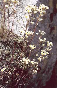 Bild links. Trauben-Steinbrech (Saxifraga paniculata) auf dem Weg vom Pfitscherjoch zur Landshuterhütte. Die Ausbildung der Blattrosetten ist eine Anpassung an den Gebirgsstandort. Die Abstände der Blätter auf der Sproßachse werden sehr kurz gehalten. Einzelne Rosetten können sich zu ganzen Rosettenpolstern entfalten. Die gezähnten Blätter dieser immergrünen Pflanze besitzen Kalkdrüsen, spezielle Einrichtungen zur Ausscheidung überschüssigen Kalziums. Neben der Anpassung an das Hochgebirge erfolgte hier also eine zweite an den Kalkstandort.