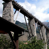 Im Aosta Tal, wo noch weniger Holz vorhanden war, wurden auch die Dächer mit Steinplatten eingedeckt. Typische Hausformen charakterisieren jede besiedelte Landschaft. Sie entstehen nicht nur aus ästhetischen Gründen, sondern auch aus praktischen und wirtschaftlichen Überlegungen heraus. Dazu gehört das Vorhandensein der Rohstoffe. Heutzutage wird nicht immer auf lokale Vorkommnisse Wert gelegt. Rohstoffe werden aus aller Welt importiert und verwendet. |