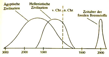 Im jetzigen Zeitalter der fossilen Brennstoffe befinden wir uns auf dem Höhepunkt. (nach F. Capra, 1988)