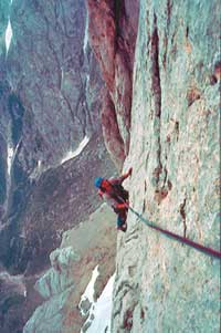Kletterei in der Route "Niagara", Pordoispitze NW-Wand. Die Erstbegeher der Route, Heinz Mariacher und Luisa Jovane, tauften die Route "Niagara" wegen eines Wasserfalls, der oft über diese Wandpartie stürzt. Im Hochsommer ist die Route meist trocken. Foto hph. |
