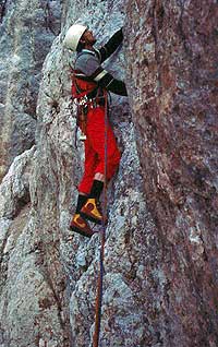 Bild oben: In der 'Via Classica' der Marmolada-Südwand. Das Unternehmen der Erstbegeher wurde bei der Generalversammlung des Deutschen und Österreichischen Alpenvereins 1901 in Meran als "sinnlose Fehlgymnastik" kritisiert. Es bestand jedoch kein Zweifel, dass damit das Zeitalter der Moderne im Schwierigkeitsklettern begonnen hatte. Die Marmolada - Südwandroute war nach der Jahrhundertwende 1900 wahrscheinlich die schwierigste Klettertour der Welt. Foto hph. |