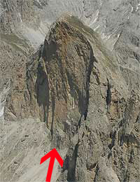 "Maestri - Führe", Erstbegehung durch Cesare Maestri 1963. - 450 Haken bei 300 m Höhe.