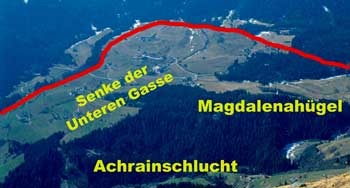 Durch den Bergsturz wurde das Tal auf der Linie Sonnenseite – Magdalenahügel - Entholz auf der gesamten Breite abgeriegelt. Die Fläche unterhalb der roten Linie ist zum Großteil mit Bergsturzmaterial bedeckt.