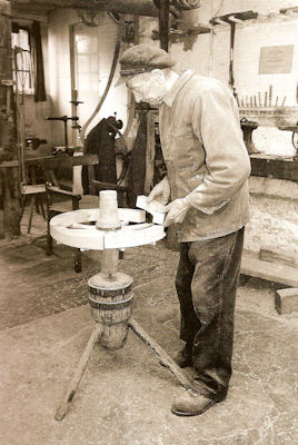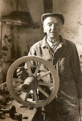 Die Festigkeit bekommt das Rad erst durch das Aufziehen von eisernen Verstärkungsringen und einem eisernen Reifen durch den Schmied. |