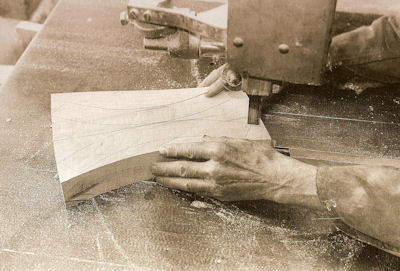 | Mit Hilfe von Radschablonen zeichnet der Wagner die Form der Felgen auf Buchenholz und schneidet sie mit der Bandsäge zu. |