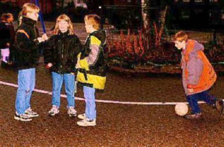 Silke, Marco und ich sprachen in der Pause über die letzte Sportstunde. Da kam Peter mit einem Fußball angerannt.