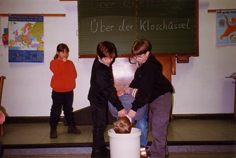 Da standen fünf oder sechs Jungen aus seiner Klasse, johlten und grölten, Rücken an Rücken dicht gedrängt. Plötzlich aber öffnete sich ein Spalt und Michel sah Arnold über die Klomuschel gebeugt, von Bertram und Klaus an beiden Schultern festgehalten. Wo war sein Kopf?