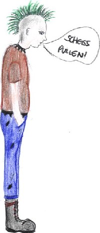 Punk: Ich sehe so aus, weil ich mir so gefalle. Ich habe keinen Bock mich so anzuziehen wie alle anderen. Punk existiert schon lange, seit den 70er Jahren. Damals war es ganz anders als heute. Diese sogenannten Punks waren noch Skin-heads, die wegen ihren schlechten Arbeitsverhältnissen auf die Straße gegangen sind um zu protestieren. Dann Mitte der 80er Jahre oder bei der Wende (1990) bildeten sich viele Gruppierungen Wie z.B der Punk (Nazis, Skin-head, Hooligan). Punks sind auf der linken Seite, das heißt, sie sind gegen alle Arten von Regierungen, gegen Gesetze, gegen Pullen usw. Ihre und meine Staatsform ist die ANARCHIE Musik: Meine Art von Musik ist Punk. Das heißt, ich höre vor allem deutschen Punkrock. Ich höre auch andere Musikarten wie Metall oder Black-Metall. Diese Musikart geht eher in die satanistische Szene. Zum Teil gefällt mir auch klassische Musik mit Orchester. |