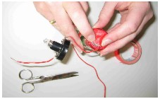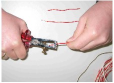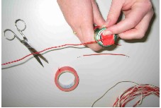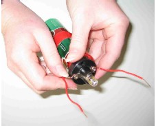 Am anderen Pol der Batterie ist ein Kabel mit einer zwischen-geschalteten Glühlampe befestigt, das mit einer nicht isolierten Öse endet. Diese Öse kann um den stabilen Draht geführt werden.