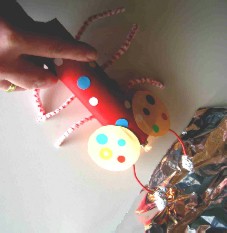 Als Stromquelle dienen zwei hintereinander angeordnete 1,5V-Batterien. Ein Leitungsdraht wird mit einem Pol einer Batterie verbunden. Das andere Ende dieses Drahtes bildet einen Fühler des Käfers. Der freie Pol der anderen Batterie wird mit der Glühlampen-fassung verbunden. Ein weiterer, von der Glühlampenfassung ausgehender Leitungsdraht, bildet mit seinem freien Ende den zweiten Fühler.