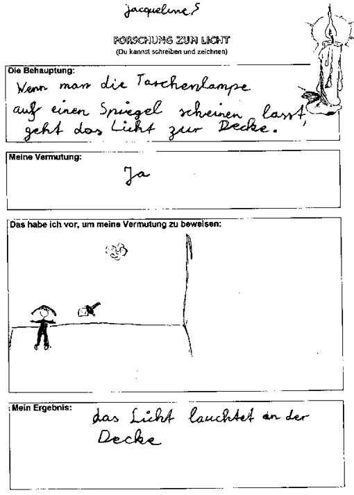 • Schattenforschung: Du brauchst einen Gegenstand, eine Taschenlampe, eine helle Wand, Pappe oder ähnliches. Erzeuge einen Schatten von dem Gegenstand auf der hellen Fläche. Was geschieht mit dem Schatten, wenn du den Gegenstand nahe vor die Taschenlampe hältst, nahe vor die helle Fläche hältst, den Gegenstand von der Taschenlampe auf die helle Fläche zu bewegst und wieder zurück, den Gegenstand zwischen Taschenlampe und heller Fläche drehst?