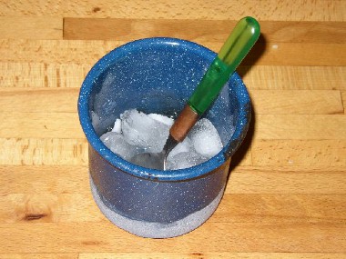 Dies geschieht in dem Bereich, in dem die Innenseite mit dem Eis-Salz-Gemisch gefüllt ist.