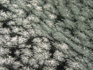 In der kalten Luft wird der Wasserdampf wieder zu kleinen Tröpfchen. Diese gefrieren an der kalten Wand des Bechers zu Eiskristallen.
