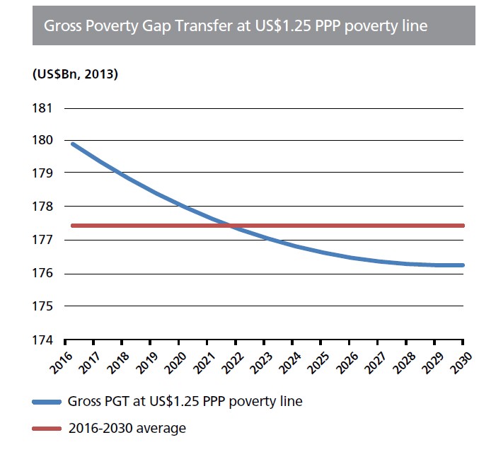 - PGT Transfer to Cover the Poverty Gap ( Betrag, um die Armutslücke zu decken, d.h. die Armen direkt auf ein minimales Einkommen von 1,25 $ pro Tag und Kopf zu bringen)
